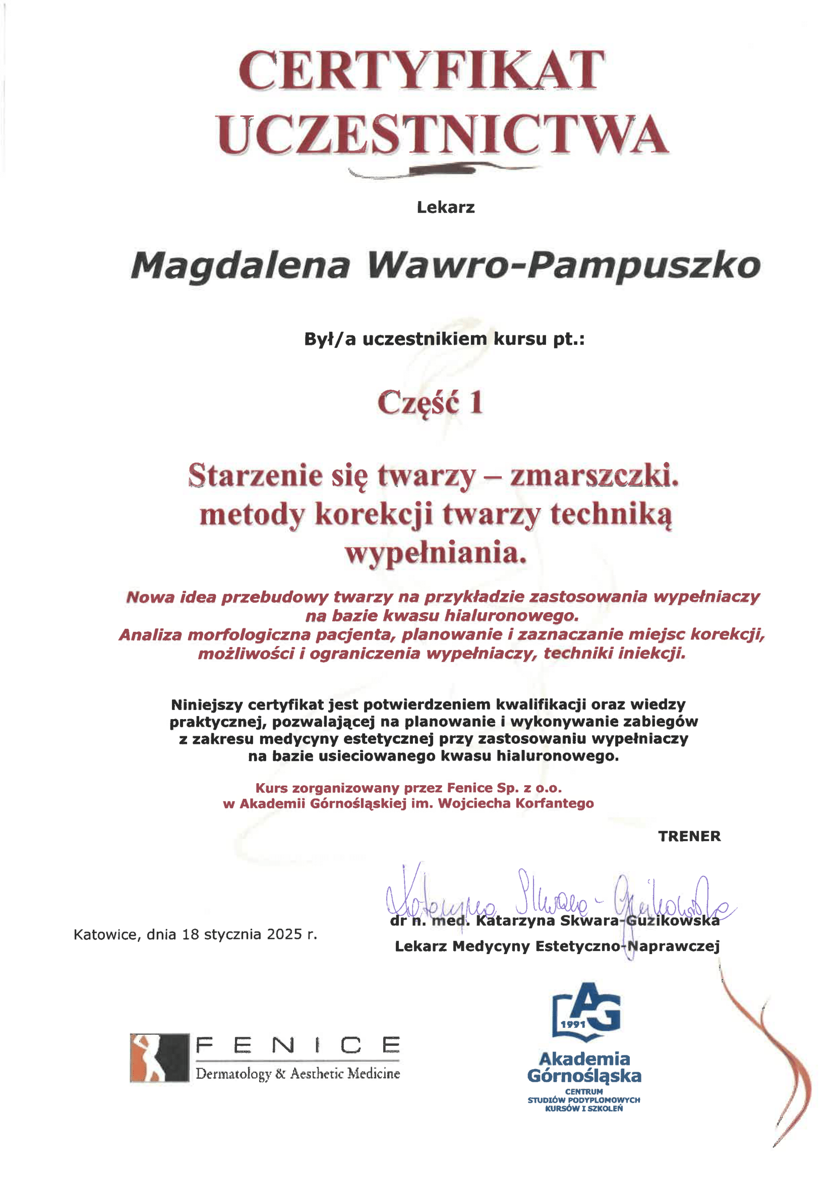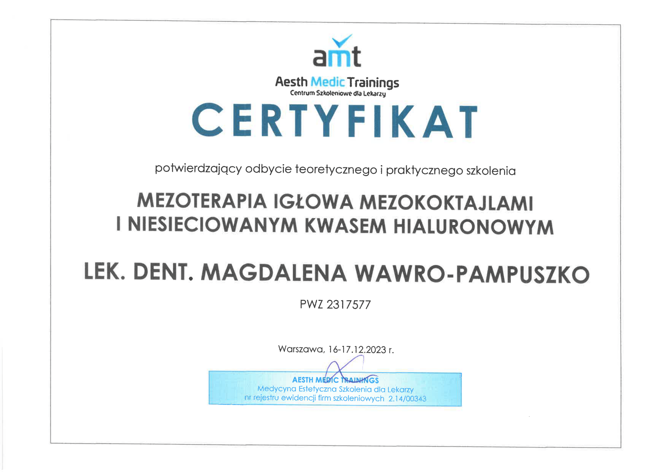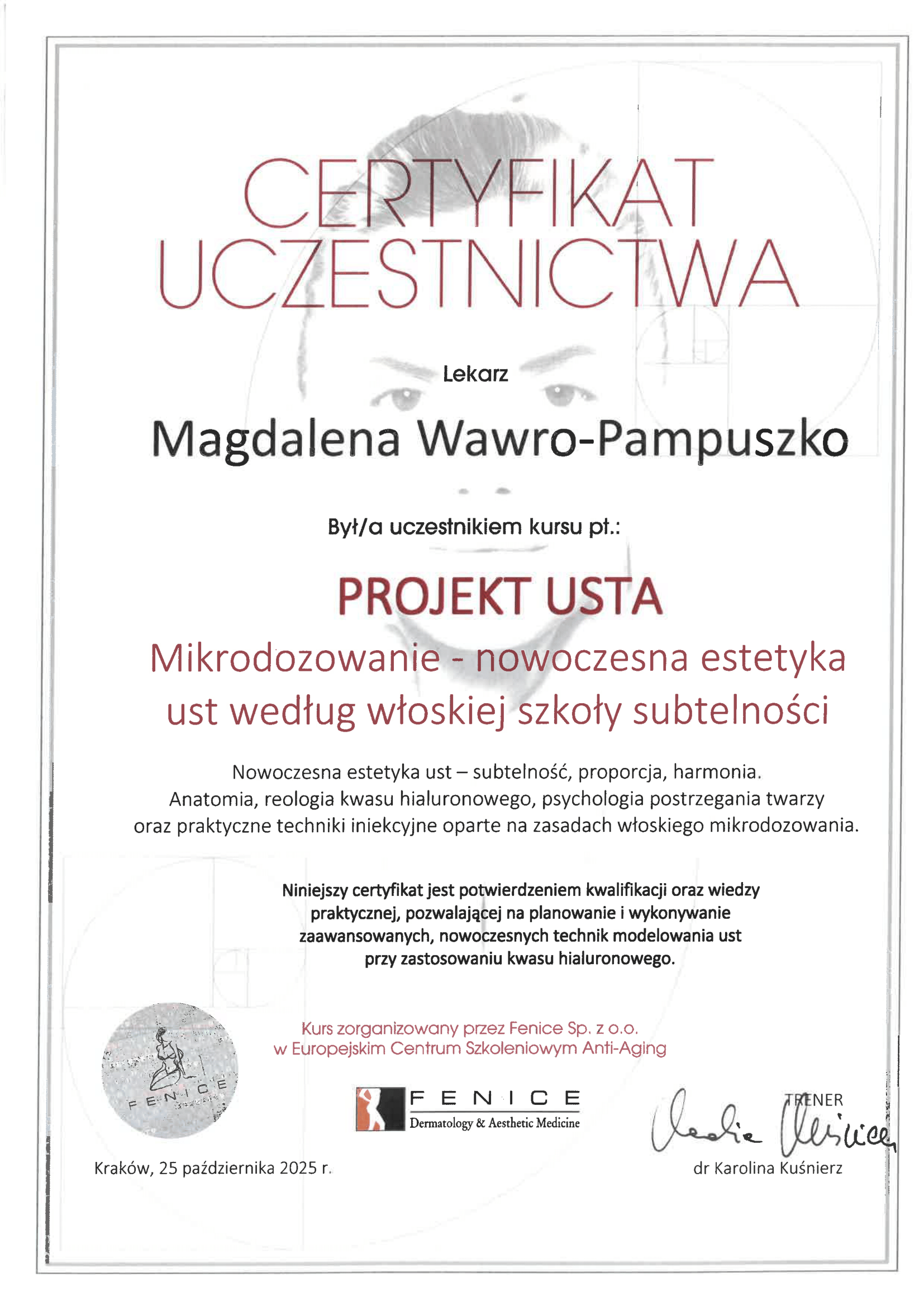 Zabiegi przeprowadza lekarz stomatolog, który ukończył studia podyplomowe z medycyny estetycznej dla lekarzy.